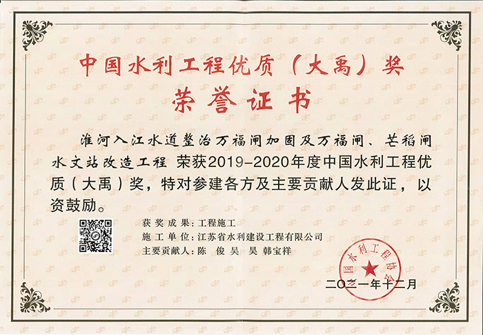 公司連續多年被評爲全國水利建設先進集體、全國優秀水利企業、全國安全生産(chǎn)和質量管理先進單(dān)位、江蘇省文明單(dān)位、建築業百強企業,榮獲江蘇省“五一勞動獎章”。